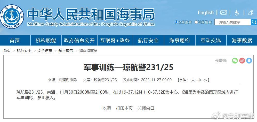据中国海事局网站消息,清澜海事局发布航行警告,11月30日20时至21时,南海部分海域进行军事训练,禁止驶入。