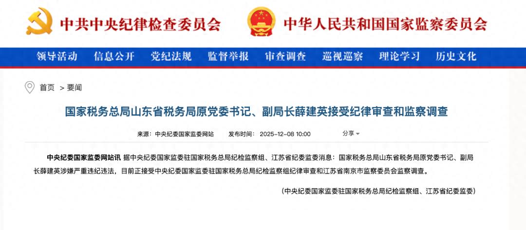 据中央纪委国家监委驻国家税务总局纪检监察组、江苏省纪委监委消息:国家税务总局山东省税务局原党委书记、副局长薛建英涉嫌严重违纪违法,目前正接受中央纪委国家监委驻国家税务总局纪检监察组纪律审查和江苏省南京市监察委员会监察调查。