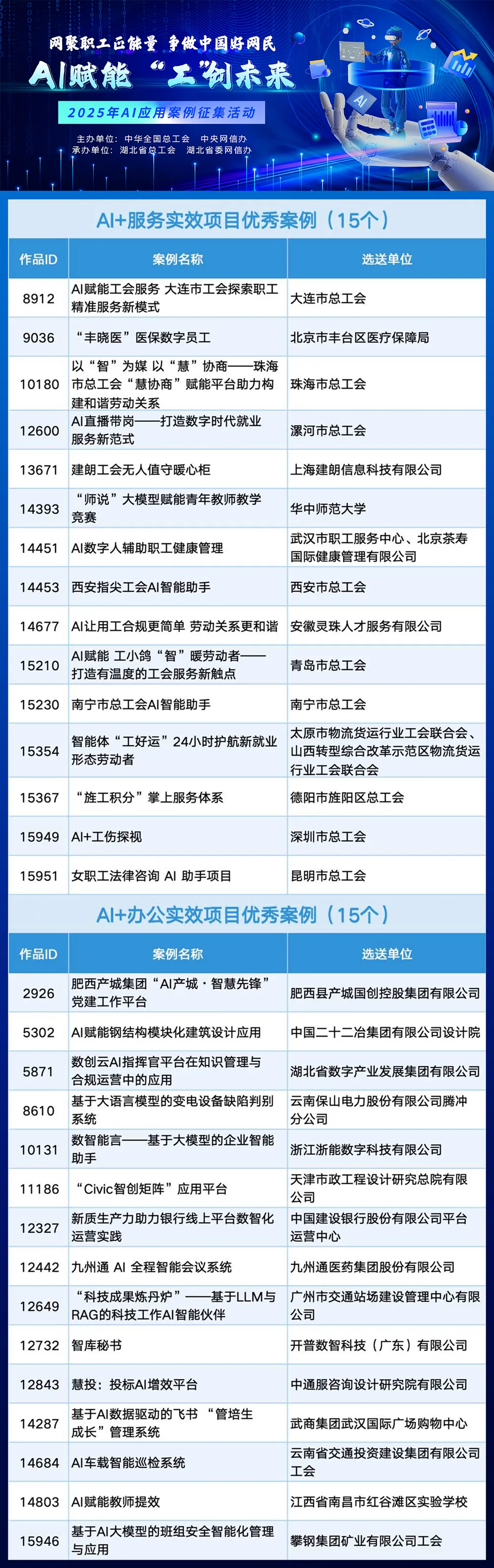 本次活动由中华全国总工会、中央网信办主办,湖北省总工会、湖北省委网信办承办,历经初评、网络投票、专家评审、公示等环节,最终评选出AI+服务实效优秀案例15个、AI+办公实效优秀案例15个。