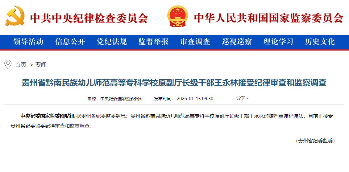据贵州省纪委监委消息:贵州省黔南民族幼儿师范高等专科学校原副厅长级干部王永林涉嫌严重违纪违法,目前正接受贵州省纪委监委纪律审查和监察调查。