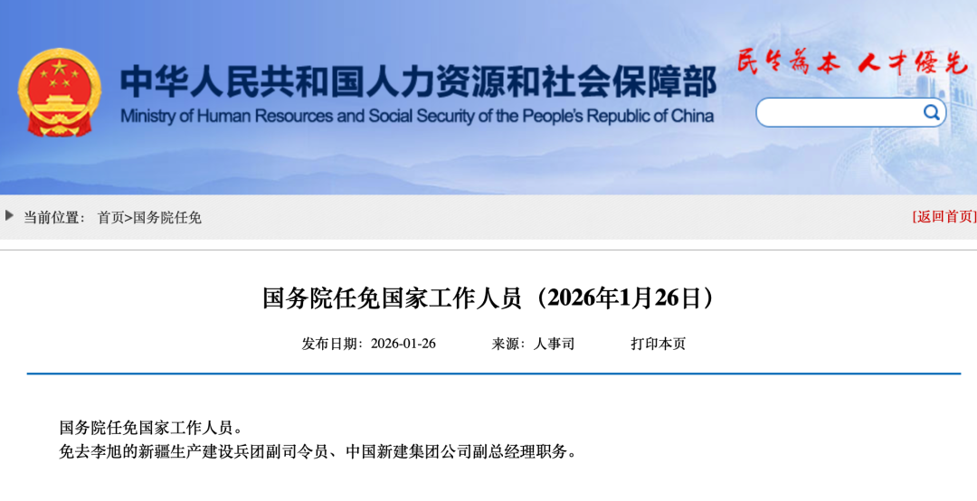国务院:免去李旭的新疆生产建设兵团副司令员、中国新建集团公司副总经理职务