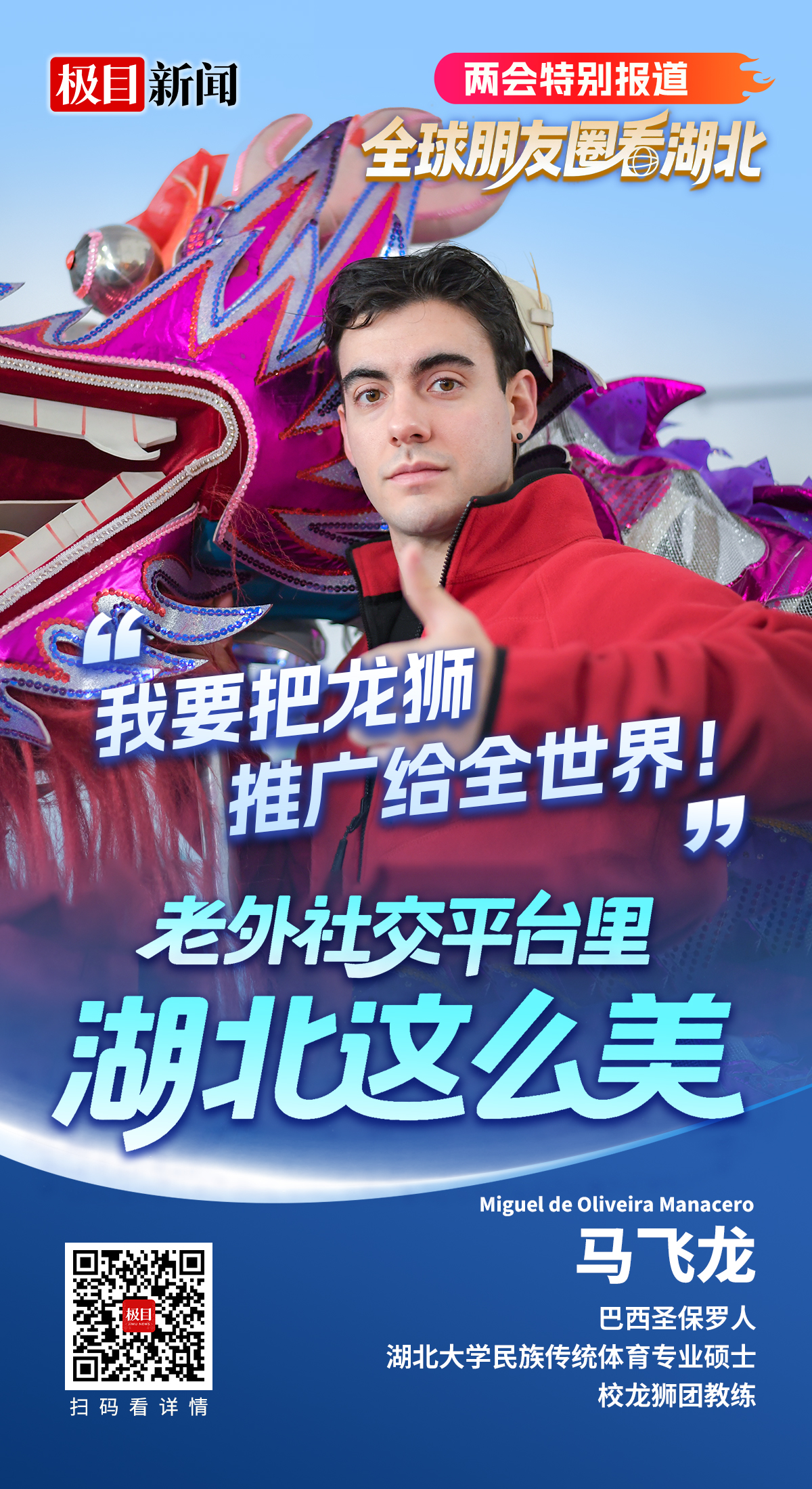 如今,马飞龙还参与组建了湖北大学首支国际学生龙狮队,今年又启动了留学生舞狮团队的培养。同样在巴西带领舞狮舞龙团队的马飞龙师兄还专程来华交流学习。而他的脚步也不止于此,“在这里,一切热爱都有回响,我要把龙狮运动项目推广给全世界!”马飞龙兴奋地说。