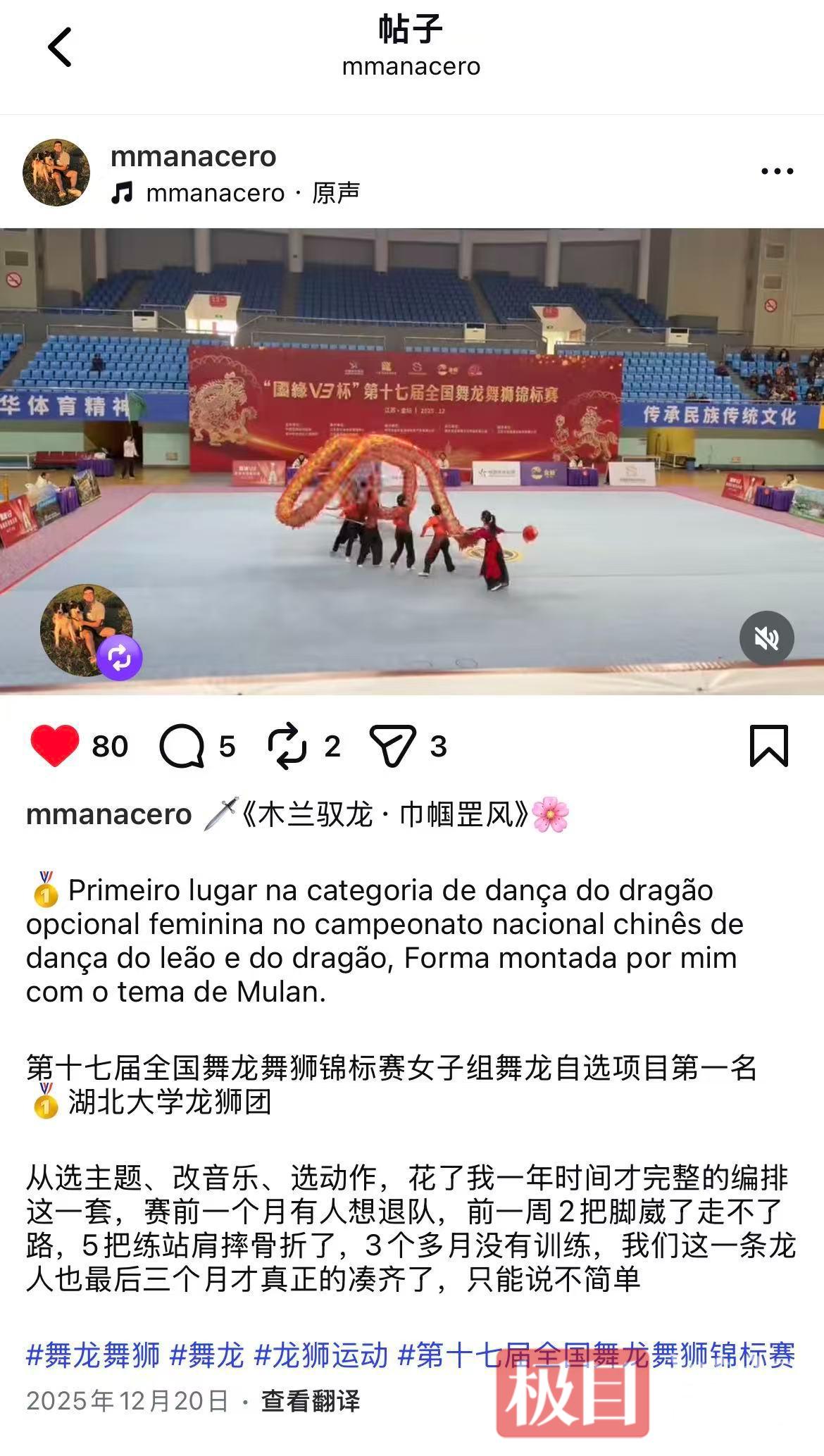 2025年12月20日,在海外社交媒体Instagram上,一条名为《木兰驭龙·巾帼罡风》的舞龙视频引来不少网友点赞。蛟龙争珠、腾龙闹海,这场精彩的表演一举摘下第十七届全国舞龙舞狮锦标赛女子组舞龙自选项目桂冠。然而令人没想到的是,这支冠军队伍的教练是位巴西小伙。