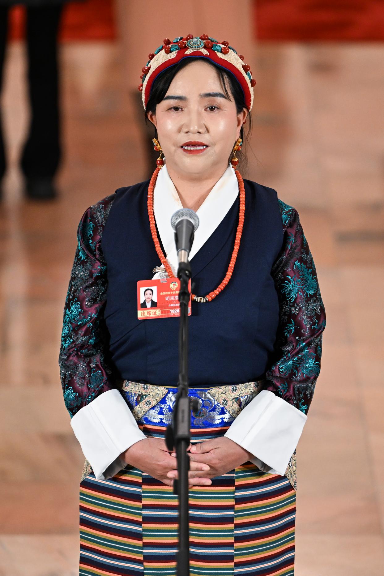这是全国政协委员明吉措姆接受媒体采访。记者:曹祎铭、陈益宸