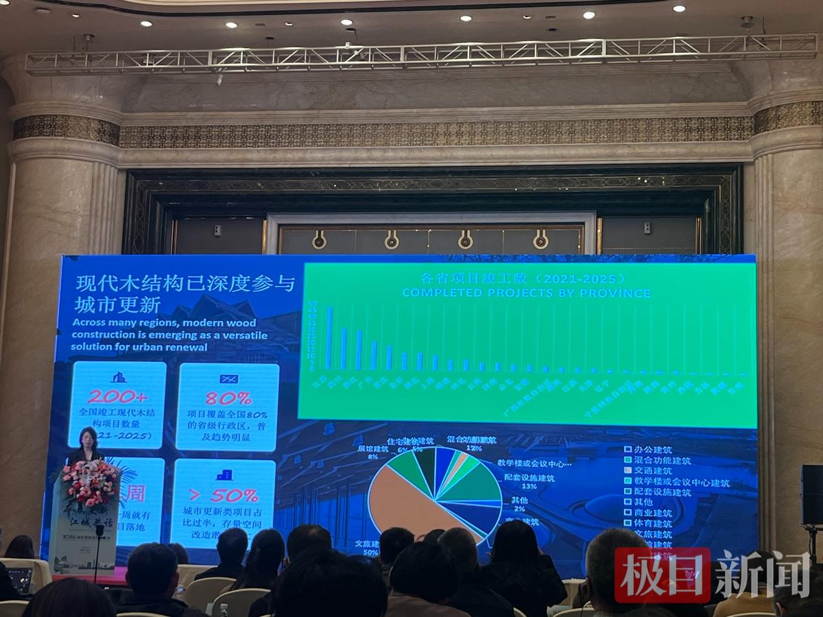 “现代木结构正成为城市更新中值得关注的绿色方案。”湖北省住建厅副厅长刘震指出,装配式木结构建筑契合国家“双碳”战略,适应城市更新“绣花”“织补”的微改造需求。在老旧小区改造、工业遗存活化、公共服务设施建设等领域,木结构展现出独特优势。