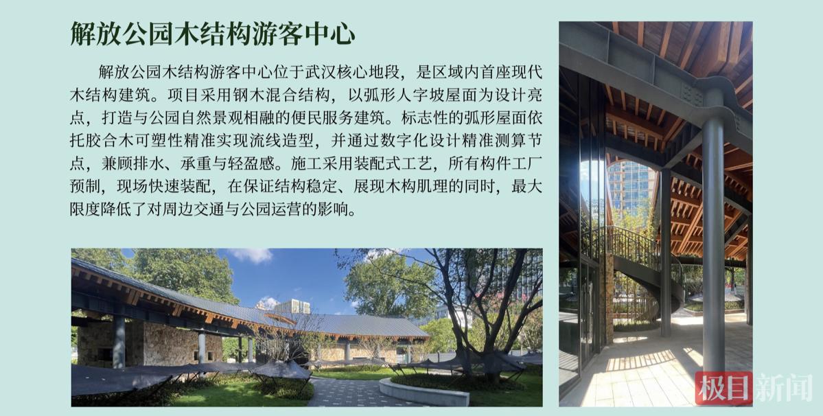 一系列融合现代木结构技术与地域文化特色的标杆项目已在湖北落地。武汉解放公园木结构游客中心是区域内首座现代木结构便民服务建筑,采用钢木混合结构与装配式工艺,所有构件工厂预制,现场快速装配。项目承建方林榔满木总经理秦丝思告诉记者:“仅用4至5人、1个月时间就建成,而传统混凝土结构至少需要4至6个月。工厂预制、现场拼装,高效低噪音,市民可能都没察觉到,一个城市中心的温润建筑就诞生了。”