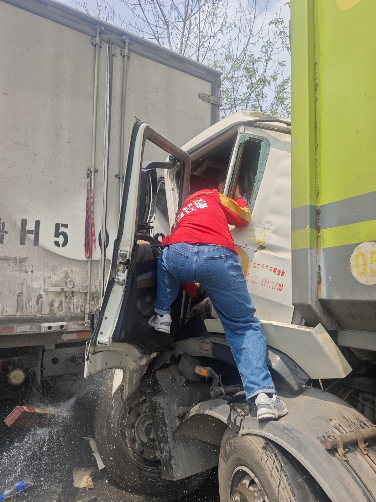 焦浩发现车窗紧闭,司机呼吸不畅,抬脚用力踢破车窗,让新鲜空气透进去,也便于后续救援。三人又协调前方的货车往前移动,尽量减轻对被困司机的挤压。