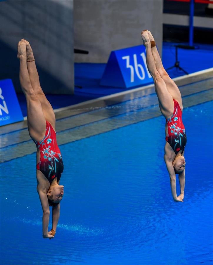 本届亚运会的女子双人3米板决赛,共有韩国、马来西亚等5对选手参赛。相比中国组合,她们的实力差距可谓是断层式的。第一跳,昌雅妮和陈艺文就跳出53.40分。接下来的四轮比赛,两人以近乎完美的表现,进一步扩大着与对手的分差。到最后一跳前,昌雅妮和陈艺文已领先第二名多达51.96分,冠军已无悬念。最后一跳,两人又得到了76.50的高分,最终以335.73分笑到最后。