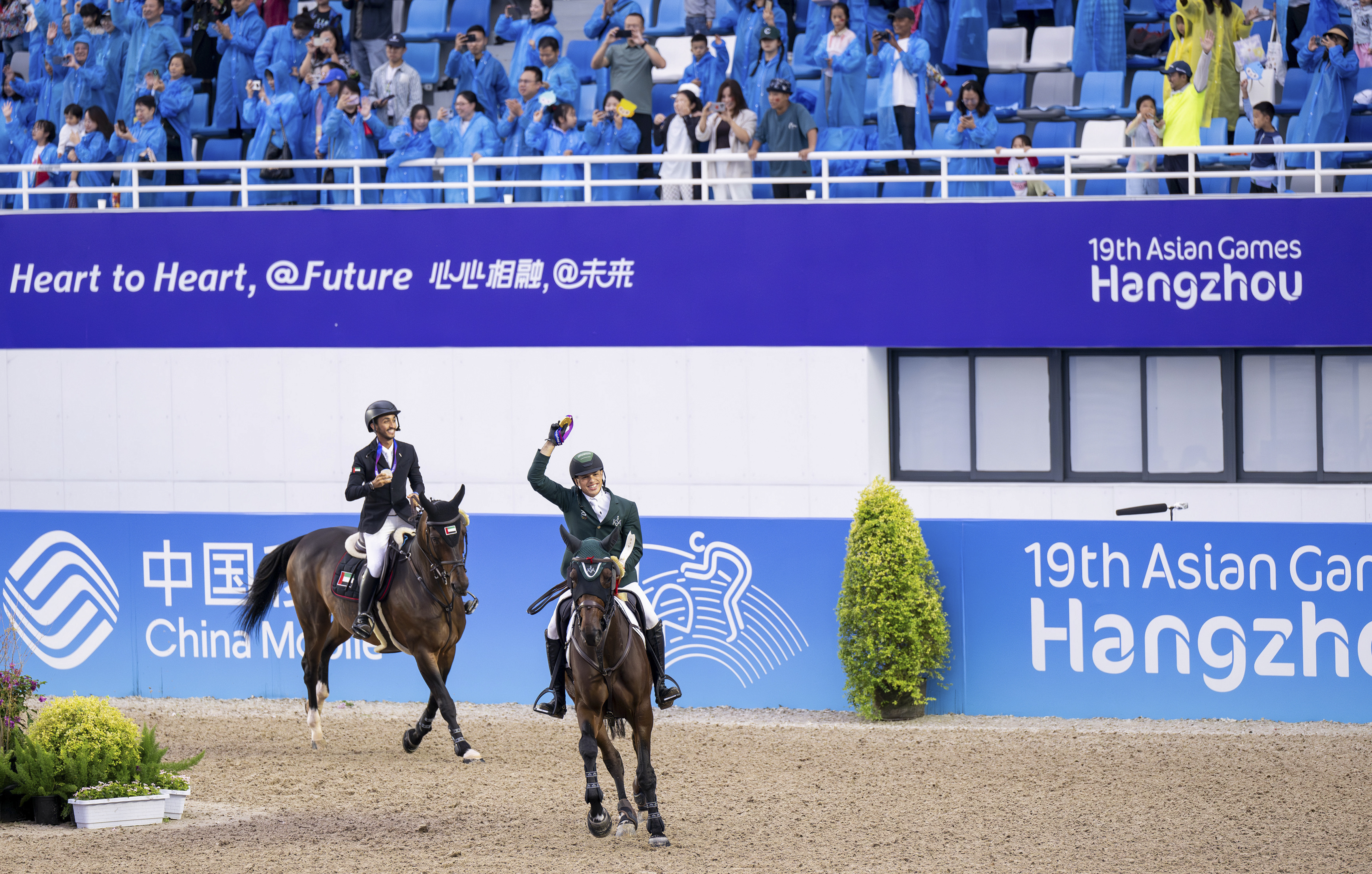 10月6日,杭州亚运会马术比赛场地障碍个人赛在桐庐马术中心进行。冠军沙特选手阿卜杜拉·瓦利德·A·沙巴特利(前)、亚军阿联酋选手奥马尔·杰奈比绕场向观众致意。新华社记者魏培全摄