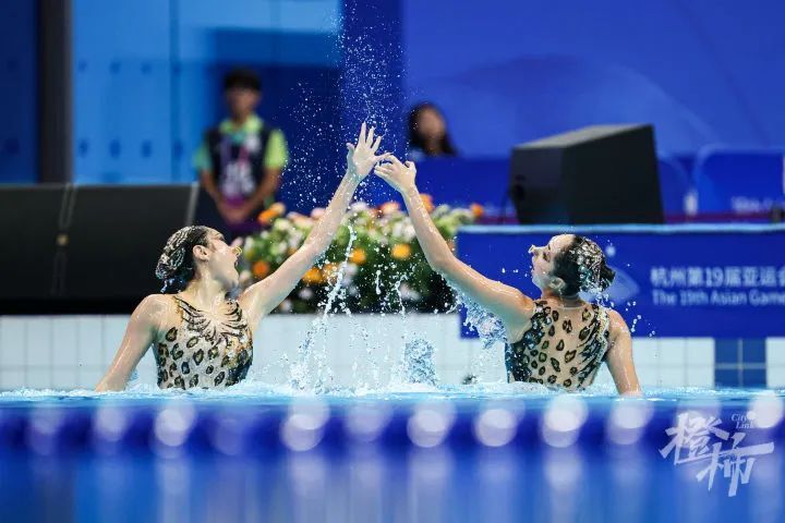 今天下午在杭州奥体中心游泳馆,这对双胞胎姐妹带来的主题是《豹》,这套动作也是在今年福冈世锦赛上表演过的,但在原有的基础上,两姐妹增加了一定的难度,更考验技巧。