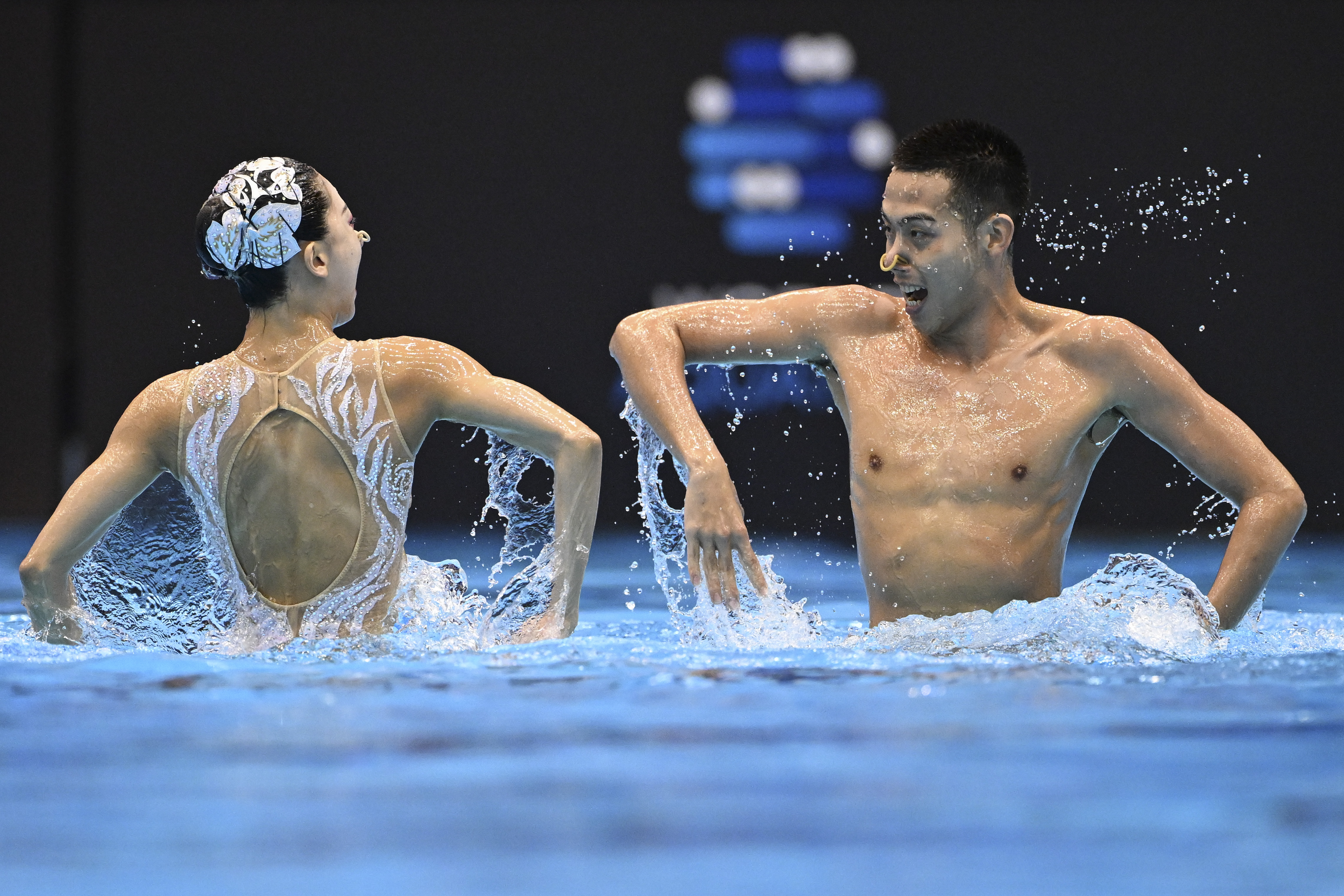 7月22日,在日本福冈举行的2023年世界游泳锦标赛花样游泳混双自由自选决赛中,石浩玙(右)/程文涛获得冠军。新华社记者许畅摄