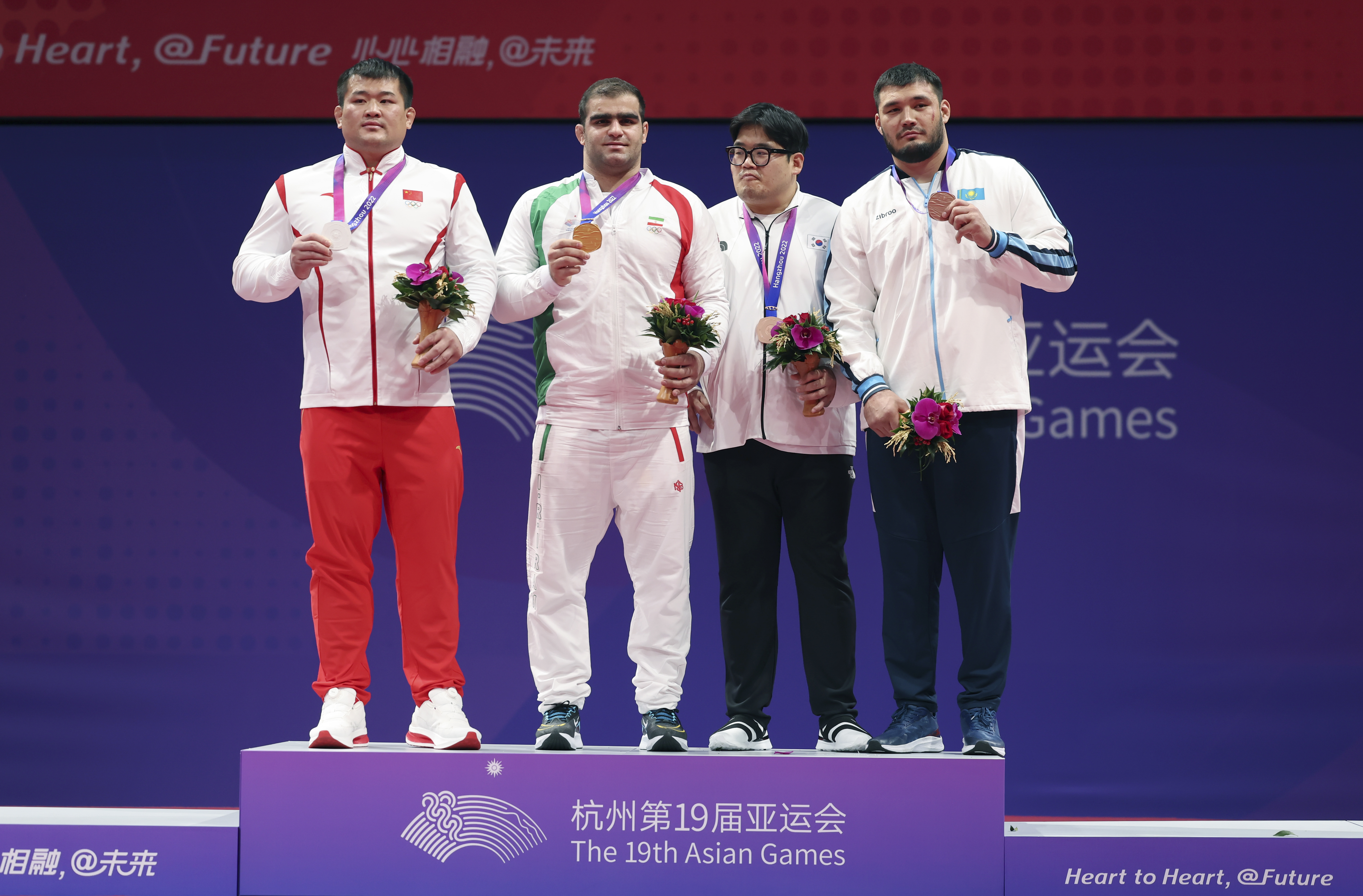 10月5日,冠军伊朗选手阿明·米尔扎扎德(左二),亚军中国选手孟令哲(左一),季军韩国选手金民石(右二)、哈萨克斯坦选手阿利姆汉·瑟兹德科夫在颁奖仪式上合影。新华社记者吴壮摄