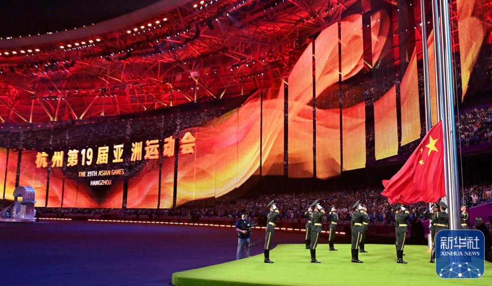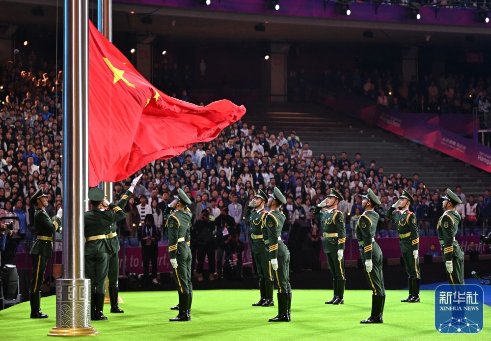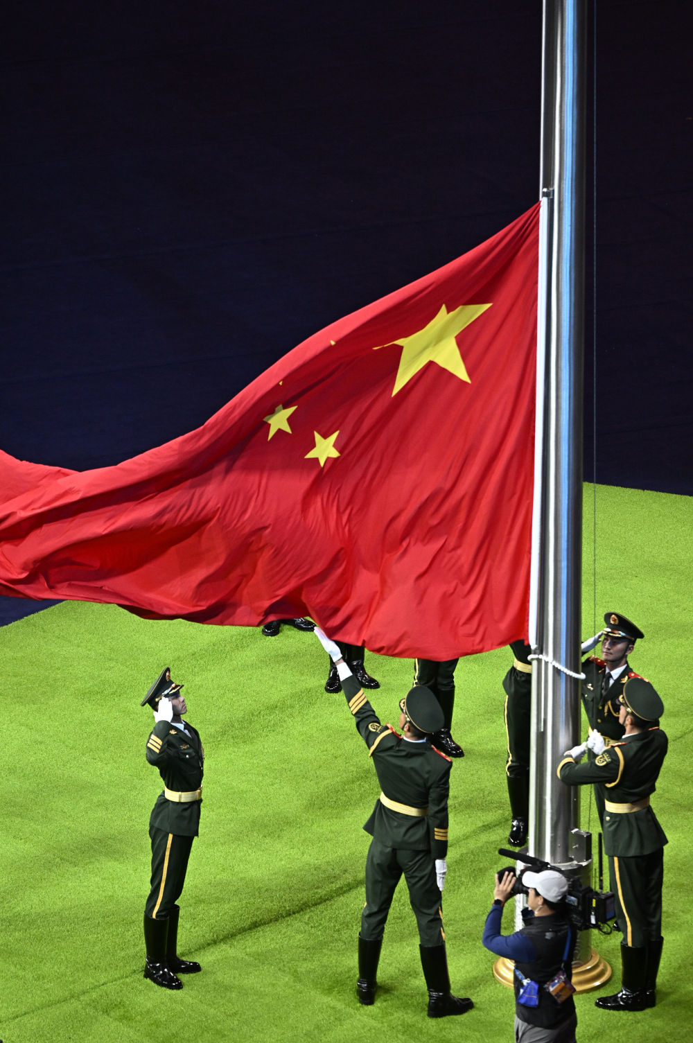 ↑中华人民共和国国旗在闭幕式上升起。新华社记者杨冠宇摄