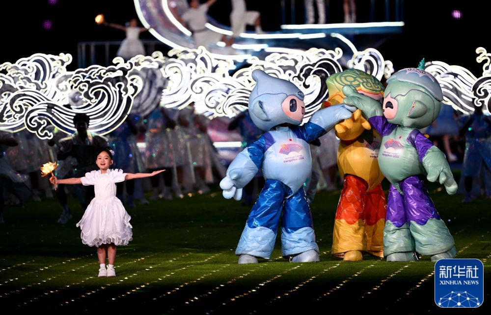 ↑杭州亚运会吉祥物在闭幕式上表演。新华社记者宋彦桦摄