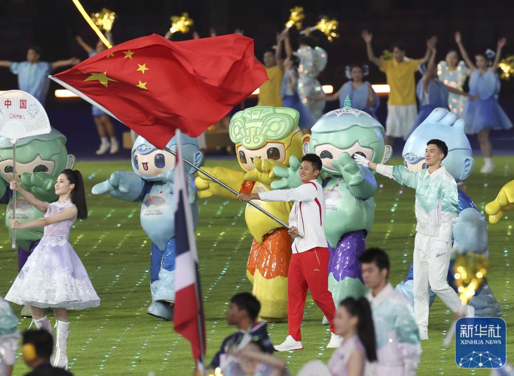 ↑中国代表团旗手谢震业在闭幕式上入场。新华社记者陈钟昊摄