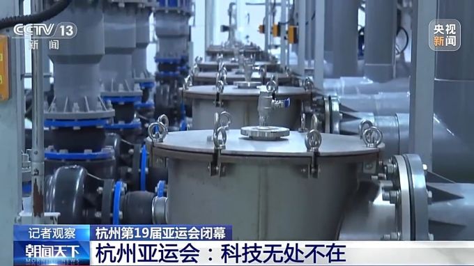 而科技的使用也助力着本届亚运会践行“绿色高效”的诺言。在我们看激烈的乒乓球比赛的时候,旁边的训练馆,由于使用了导光孔的设计,只要室外光线充足,场馆内即便不用电,也能给在这里进行训练的运动员带来充足的照明。在游泳馆,当我们看各国运动员在清澈的游泳池中劈波斩浪的时候,在游泳池的下方,一套全年不用换水的水循环系统正在高速运转,有了这套系统,游泳馆一年可节水9万吨,相当于可提供4000人一年的用水量。还有可以自清洁的场馆外立面,可以吸水的屋顶,当科技与“节俭办亚运”相合,我们看到的是绿色、环保、无废的新的亚运办赛理念的成功实践。