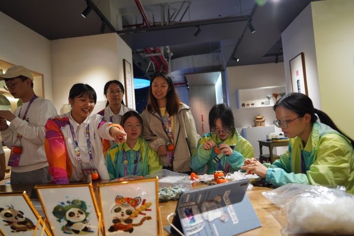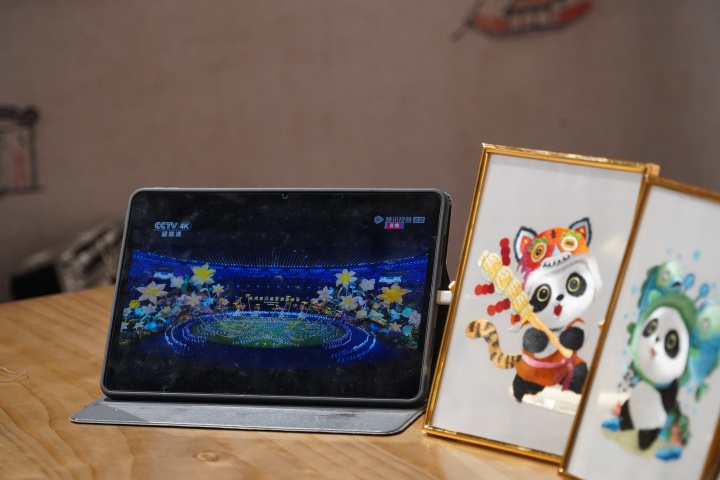 这是杭绣省级非物质文化传承人金家虹徒弟金冬第六次,也是最后一次在媒体村文化屋进行杭州刺绣的展示和互动。相比以往文化屋里的各国记者不断往来,此时的文化屋只有Ipad里闭幕式的直播声和金冬教志愿者、工作人员们做“柿柿如意”刺绣小挂饰的轻声细语。