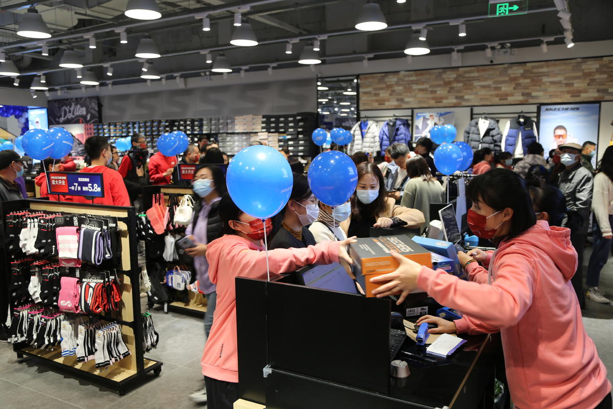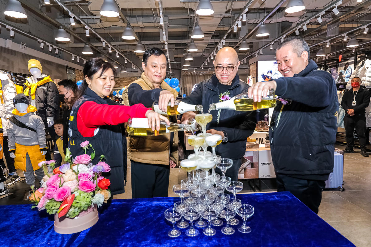 在揭幕仪式后,在场的嘉宾同广大顾客一起开启探店模式。当天,斯凯奇举办奥莱大店的开业酒会,武商集团董事长陈军携班子成员到场助阵,为品牌送上祝福。熊猫家族人偶、趣味互动游戏以及一件7折、两件5.8折的劲爆活动,引得柜内人气十足、人头攒动。