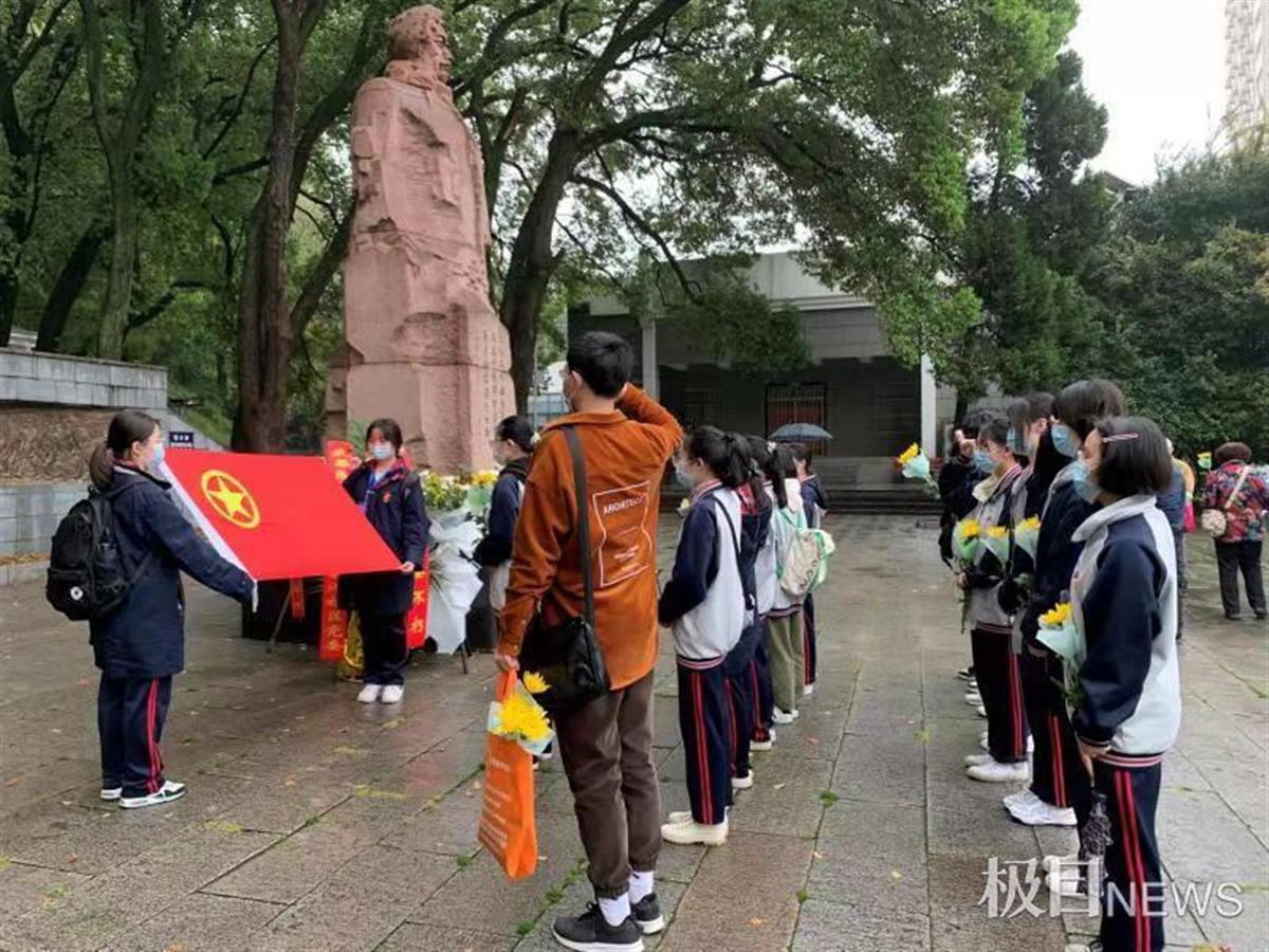 在施洋烈士雕像下,大家齐唱国歌,对革命先烈表示缅怀,武汉市第二职教中心教师胡道伦向大家介绍了施洋烈士的事迹,“当时,京汉铁路工人举行总罢工,施洋是罢工的领导者之一。”