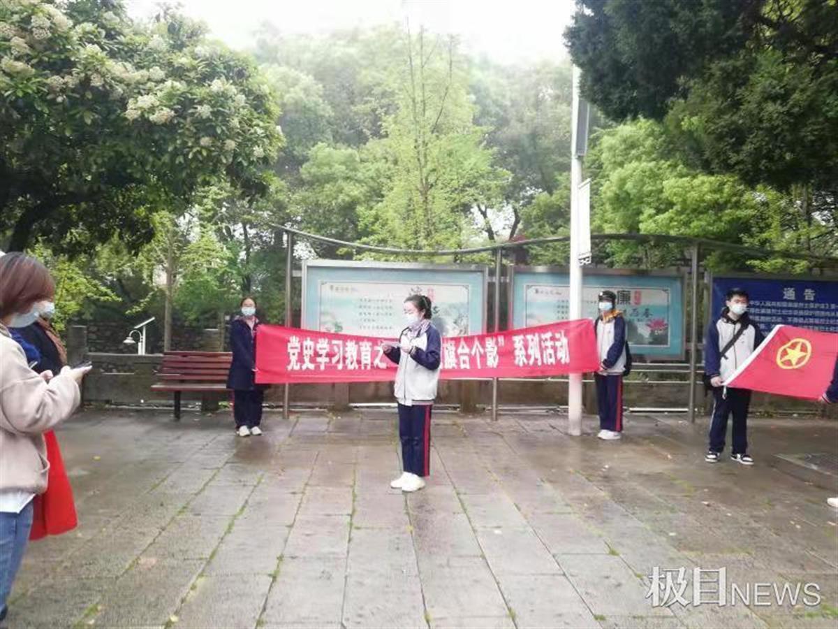 一行人来到广场,社区党员结合学党史活动,晒党龄、讲故事、表决心;青年团员们仔细聆听,分享学习心得。