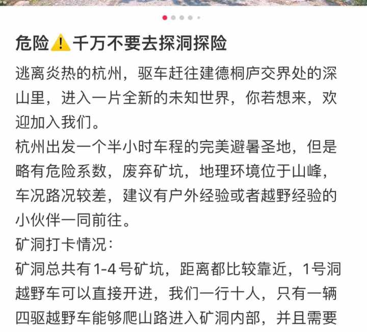 矿山危险,却止不住部分游客的“探险欲望”。钱江晚报·小时新闻记者发现,小红书上有不少野外爱好者,喜欢组织一些探洞探险活动,如建德废弃矿洞、岑岭矿坑(目前已关闭)、翡翠湾等野生矿坑被屡屡提及,并带有#矿坑露营#的话题。
