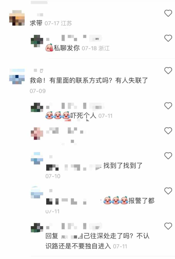 然而,这样的提示或许对于那些渴望寻求野外冒险的人来说意义不大。钱江晚报·小时新闻记者翻看评论区发现,不少这样的帖子下,都是一连串的“求带”。发布者是否有旅游经营资质,暂不得而知,这些“求带”的游客里,是否具备一定的户外经验,也是未知数。在一条溯溪地推荐的评论区里,还有人求助,询问里面的联系方式,并表示有人失联。后续又回复“找到了,报警了已经。”
