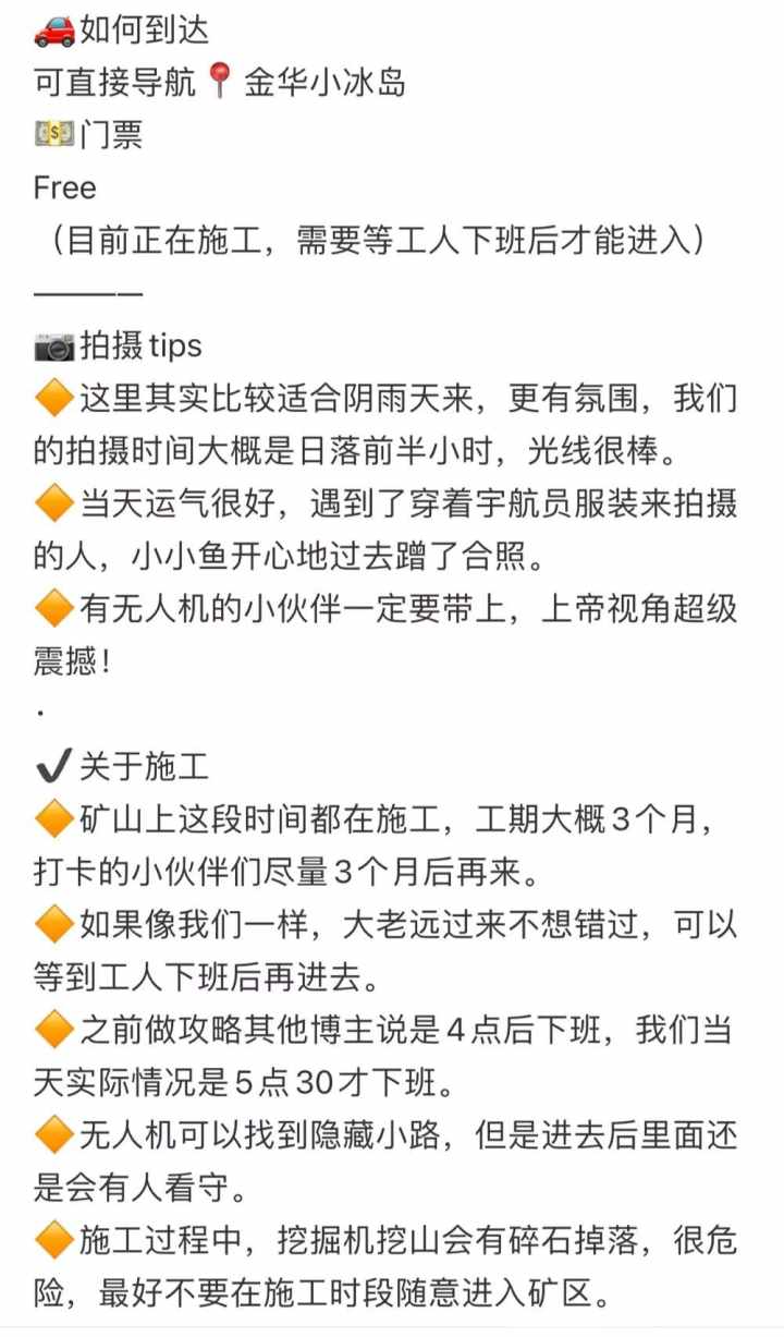 然而,此处矿山时常发生落石,有较大的安全隐患。在小红书2700多篇笔记里,只是部分博主提到落石危害,更多博主内容为拍照教学等。2022年5月,金华启动了废弃矿山治理工程,目的在于消除安全隐患,预计10月底完工。