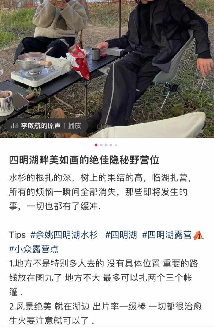 有博主分享四明湖“隐秘”野营位。