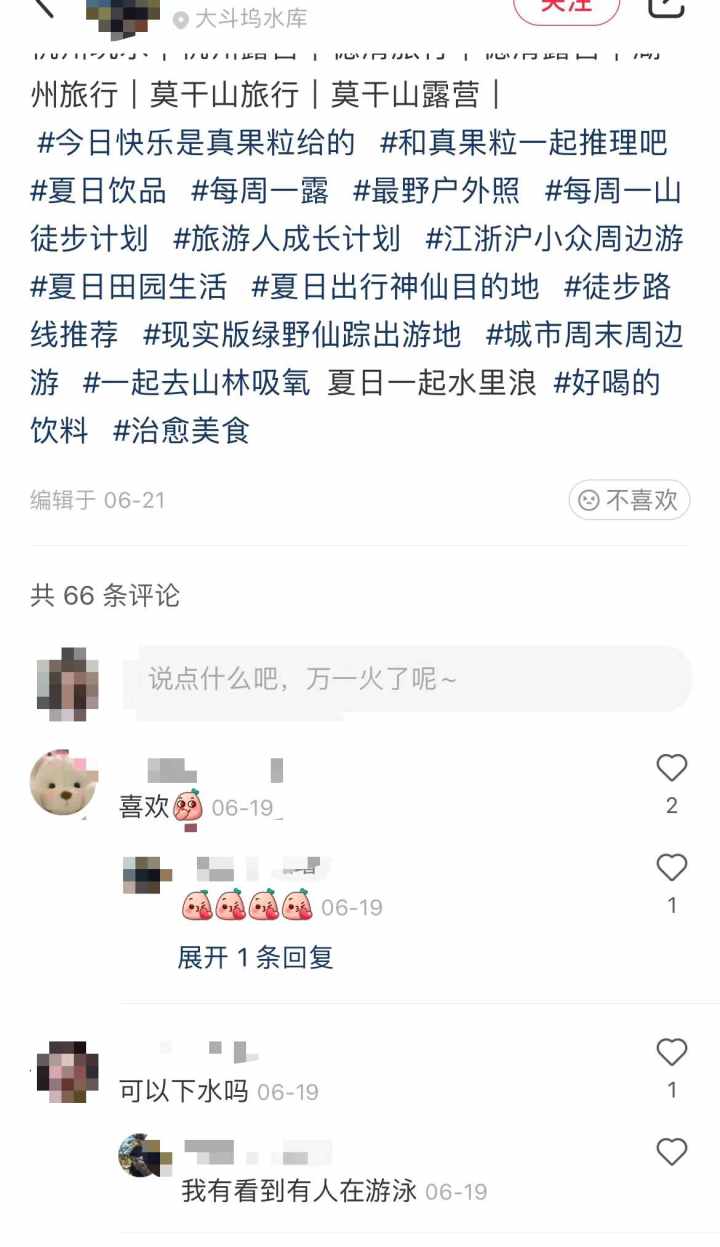 水库露营并不安全,钱江晚报·小时新闻记者在搜索中发现,类似桐庐肖岭水库、台州仙居谷坦水库、湖州德清大斗坞水库等野生水库露营笔记,均有人在评论区提到“我看到有人下水游泳了”“露营晚上水涨了”这一类现象。可见此类野生的“水库露营点”,在没有足够的配套设施和安全设施前提下,仍存在许多安全隐患。