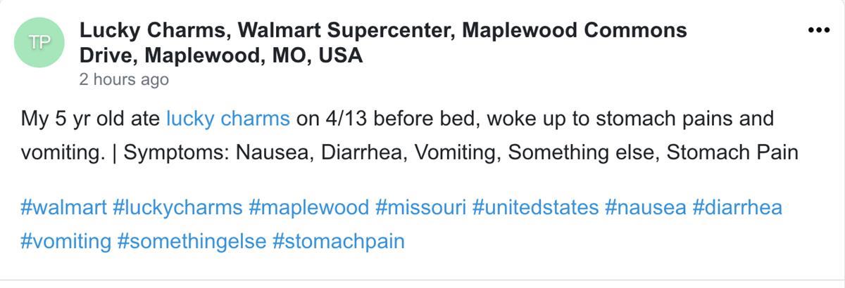 “我儿子每周早餐会吃几次‘幸运符’,过去4个月里,他因呕吐和腹泻而缺课,一直胃痛。”另一名新泽西州用户写道。