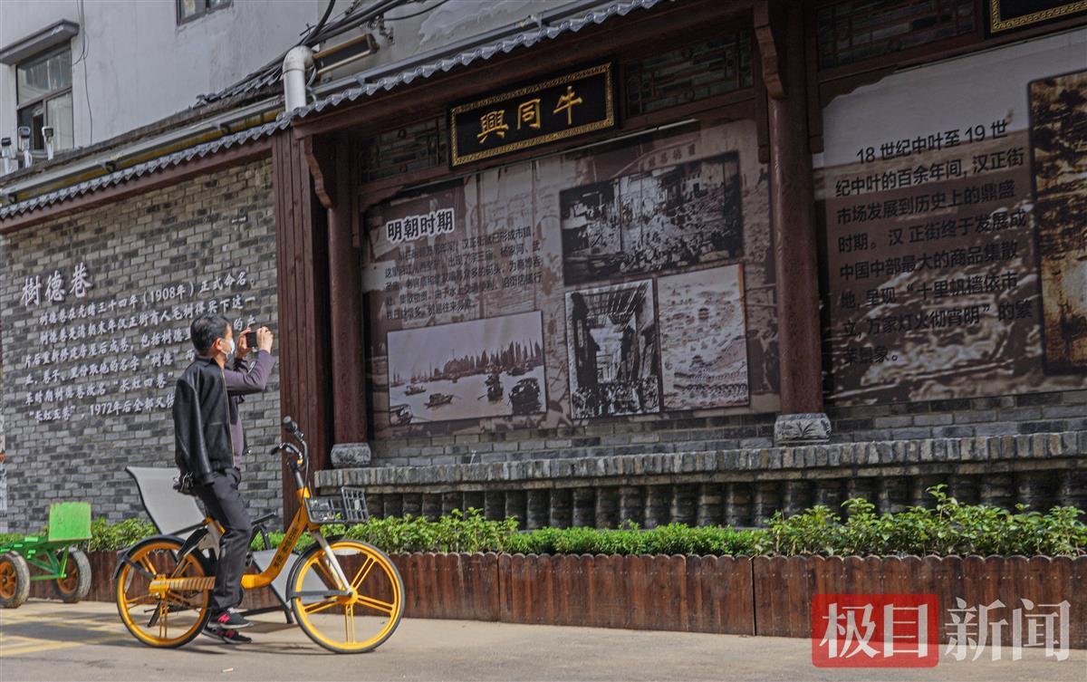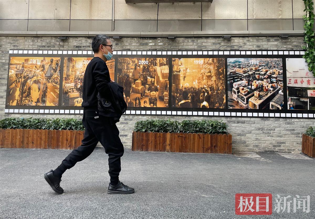 4月6日,极目新闻记者在武汉市汉正街永茂社区看到,文化墙上的45幅老照片,反映了近代宝庆码头、集家嘴一带货运交易繁忙的盛况,重现了叶开泰、谦祥益、汪玉霞、苏恒泰等中华老字号的原貌,展示了改革开放后汉正街小商品市场人流如织的景象,浓缩了汉正街从明朝万历年间开始长达500余年的商贸历史。老照片吸引了来来往往的人驻足观看。