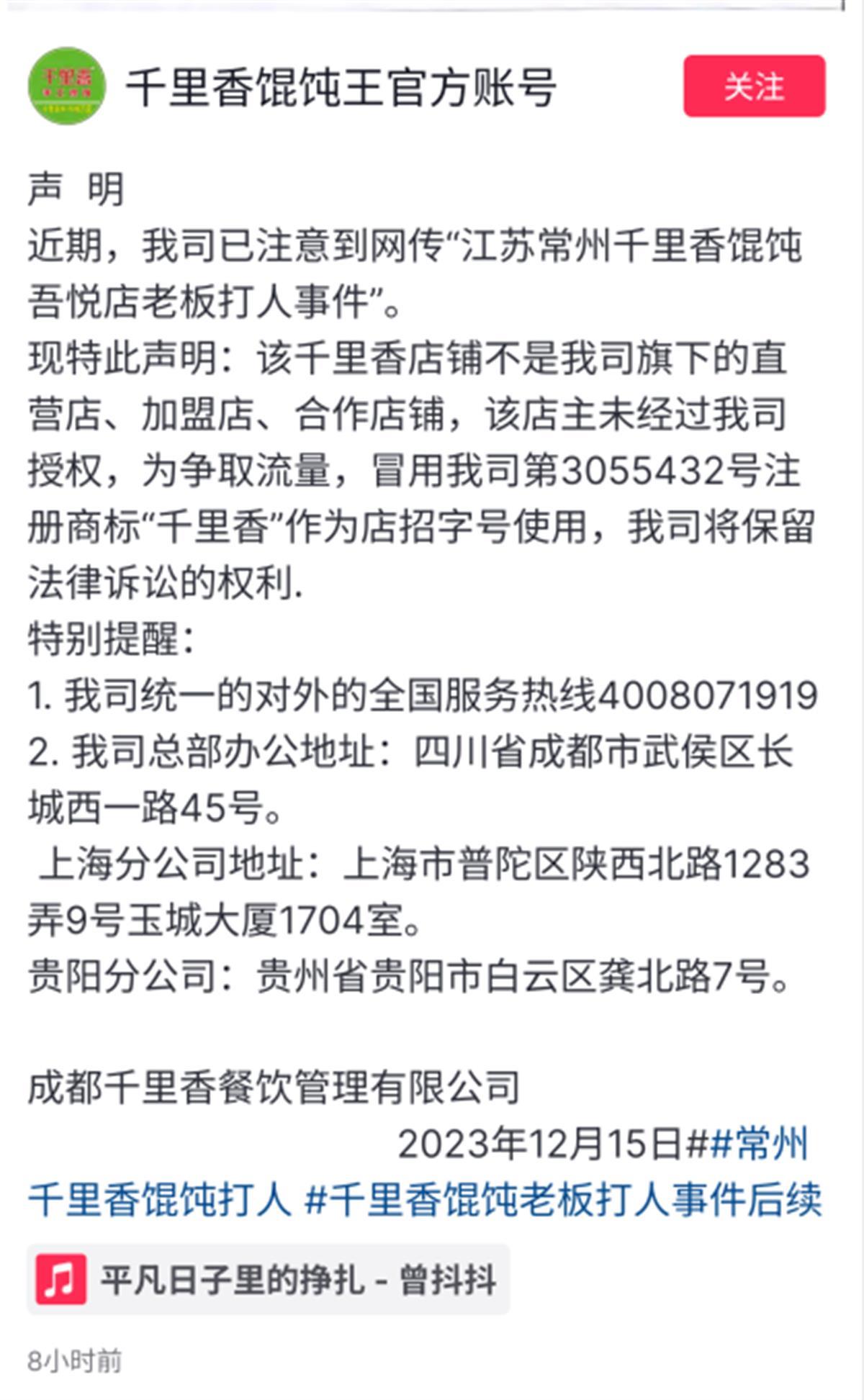 极目新闻记者注意到,12月15日,千里香馄饨王官方账号发布声明称:“近期,我司已注意到网传‘江苏常州千里香馄饨吾悦店老板打人事件’。现特此声明:该千里香店铺不是我司旗下的直营店、加盟店、合作店铺,该店主未经过我司授权,为争取流量,冒用我司第3055432号注册商标‘千里香’作为店招字号使用,我司将保留法律诉讼的权利。”