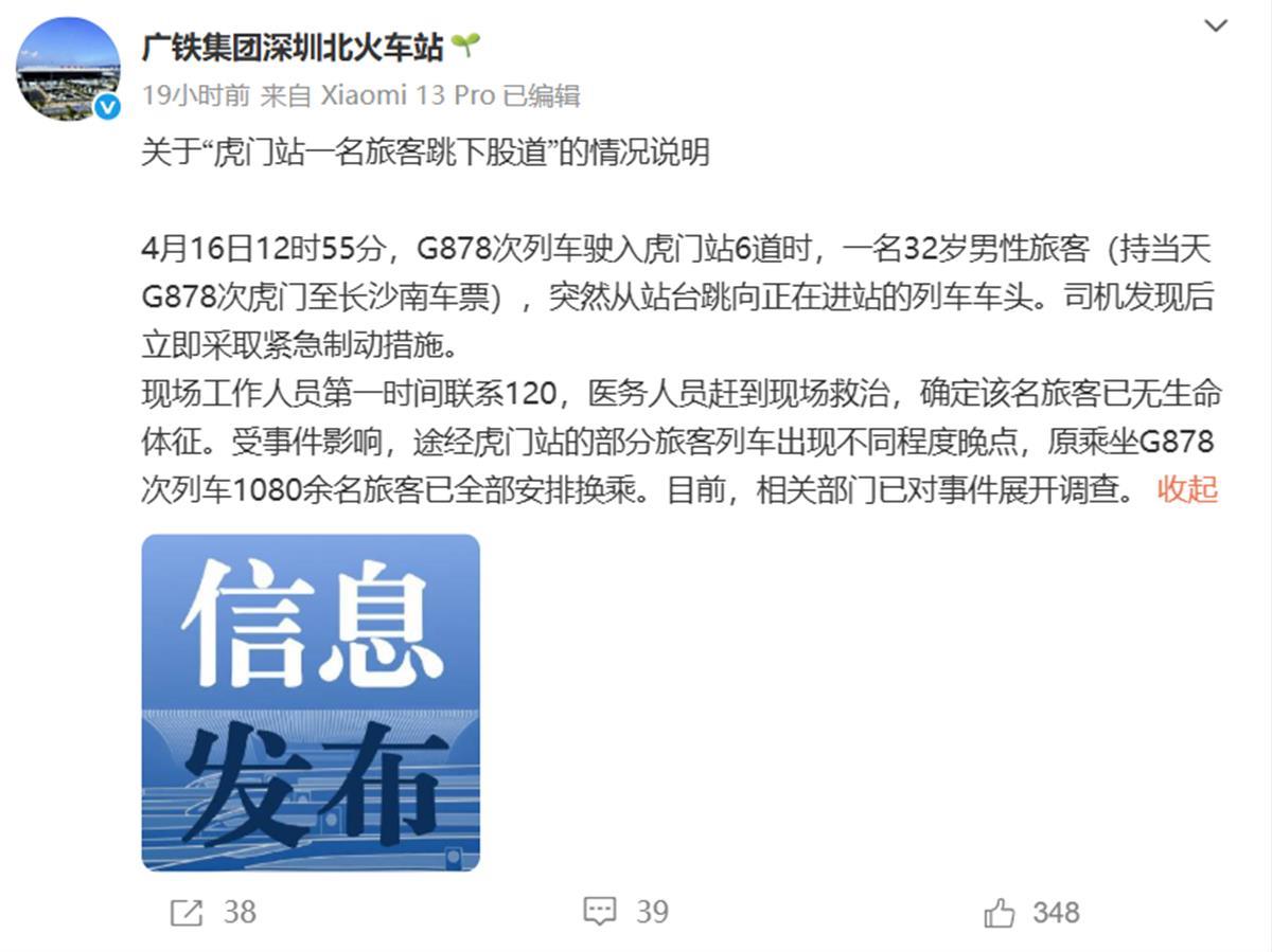 广铁集团深圳北火车站发布情况说明:4月16日12时55分,G878次列车驶入虎门站6道时,一名32岁男性旅客(持当天G878次虎门至长沙南车票),突然从站台跳向正在进站的列车车头,司机发现后立即采取紧急制动措施。