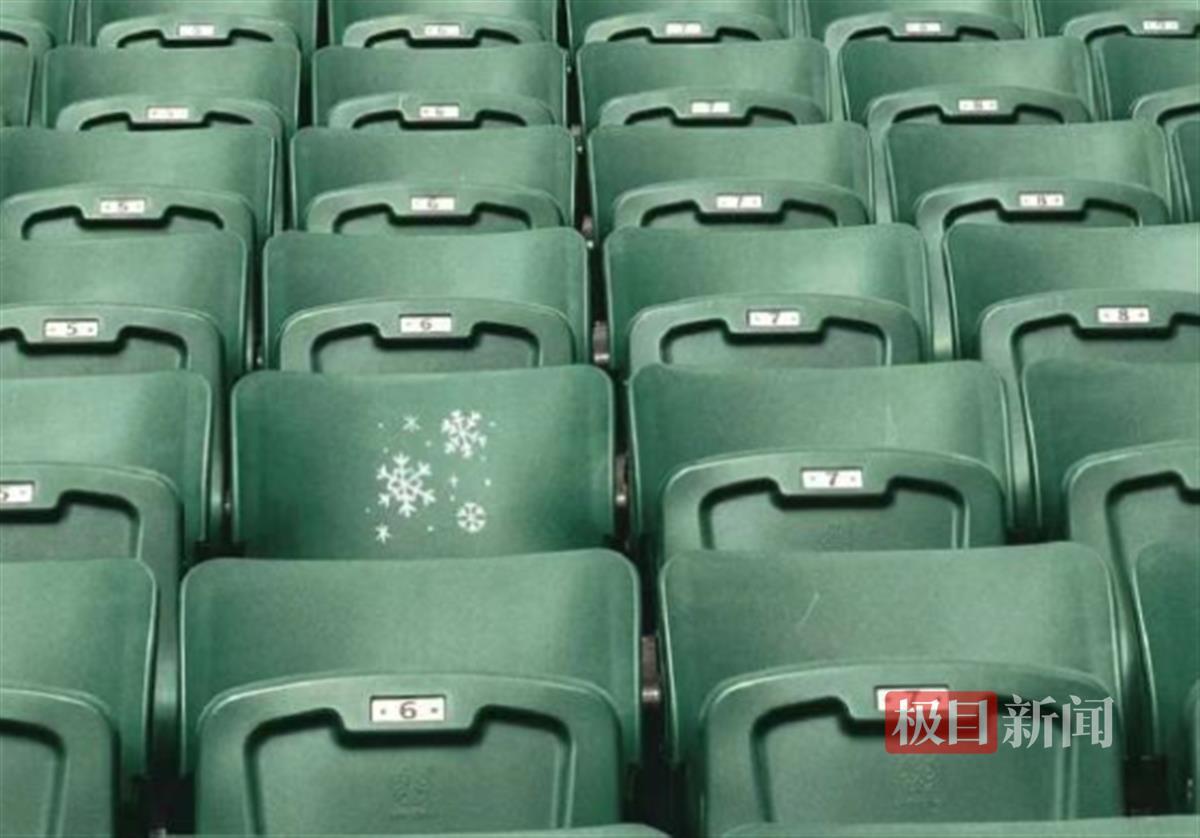 4月3日,北京工体绿色的看台上,一张座椅被喷涂了几朵洁白的雪花。