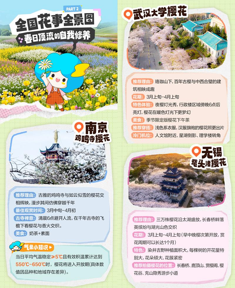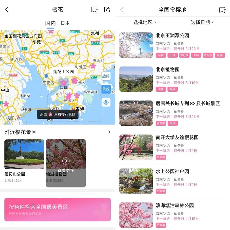 以樱花、桃花、油菜花为例,墨迹天气预报App能够为用户提供精准到以天为单位的“花期预测”服务。从墨迹天气花期预测地图来看,早在2月,以广州、福州为代表的华南一带就已进入樱花黄金观赏期;到了3月,以武汉、南京为代表的长江流域的樱花陆续盛放;即将到来的4-5月,北京、青岛等北方地区的樱花也将绽放;3月下旬至4月上中旬,北京、林芝、包头、乌鲁木齐等城市的桃花陆续进入盛开期;3月中旬至4月由南至北逐渐进入油菜花盛花期。