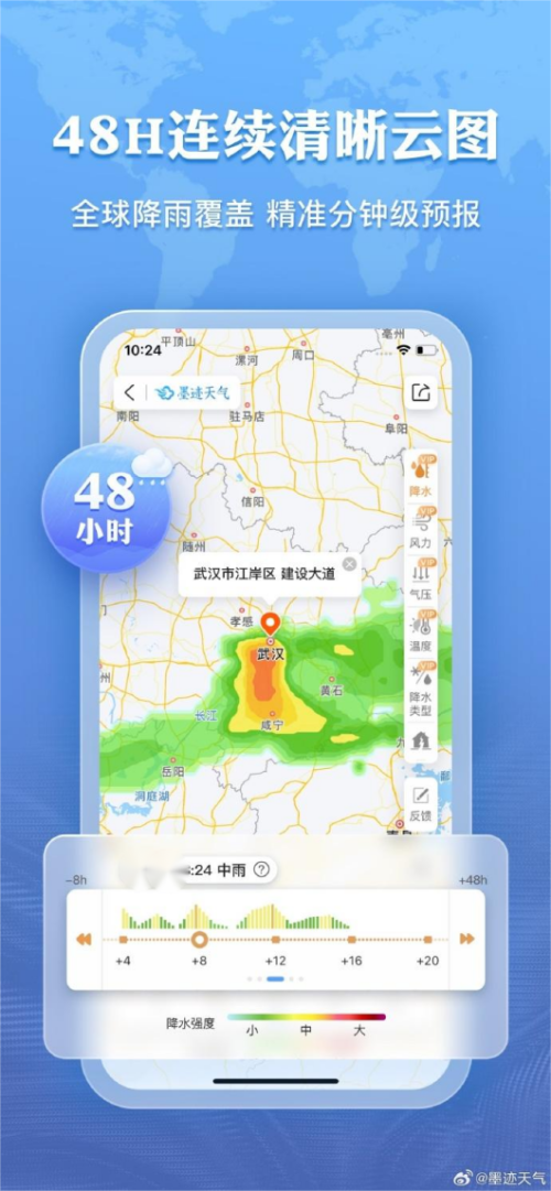 4月22日晚至24日,受高空槽、切变线和冷空气共同影响,广西中部地区将迎来中雨、局地暴雨,并伴有短时雷暴大风、冰雹等强对流天气。墨迹天气作为全球首个能够实现分钟级连续48小时降水预报的气象产品,完成2km网格/6分钟间隔的降水预告,实现全球范围内未来48小时下雨区域预报精准到分钟级;未来48小时雨云运动和发展趋势的高清平滑展示,通过多数据融合,将气象情况的参考数据量提升了15倍,递进式供给降水预报预警服务产品和建议。