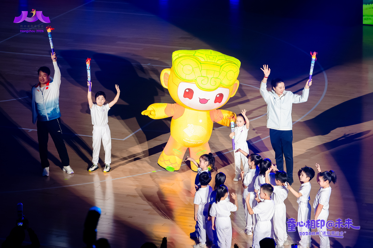 备受瞩目的火炬传递环节,残奥会游泳冠军宋懋璗与游泳世界冠军杨雨亲临现场,将象征亚运精神传承的火炬,传递给六位有武术、艺术体操等运动特长的小小火炬手。