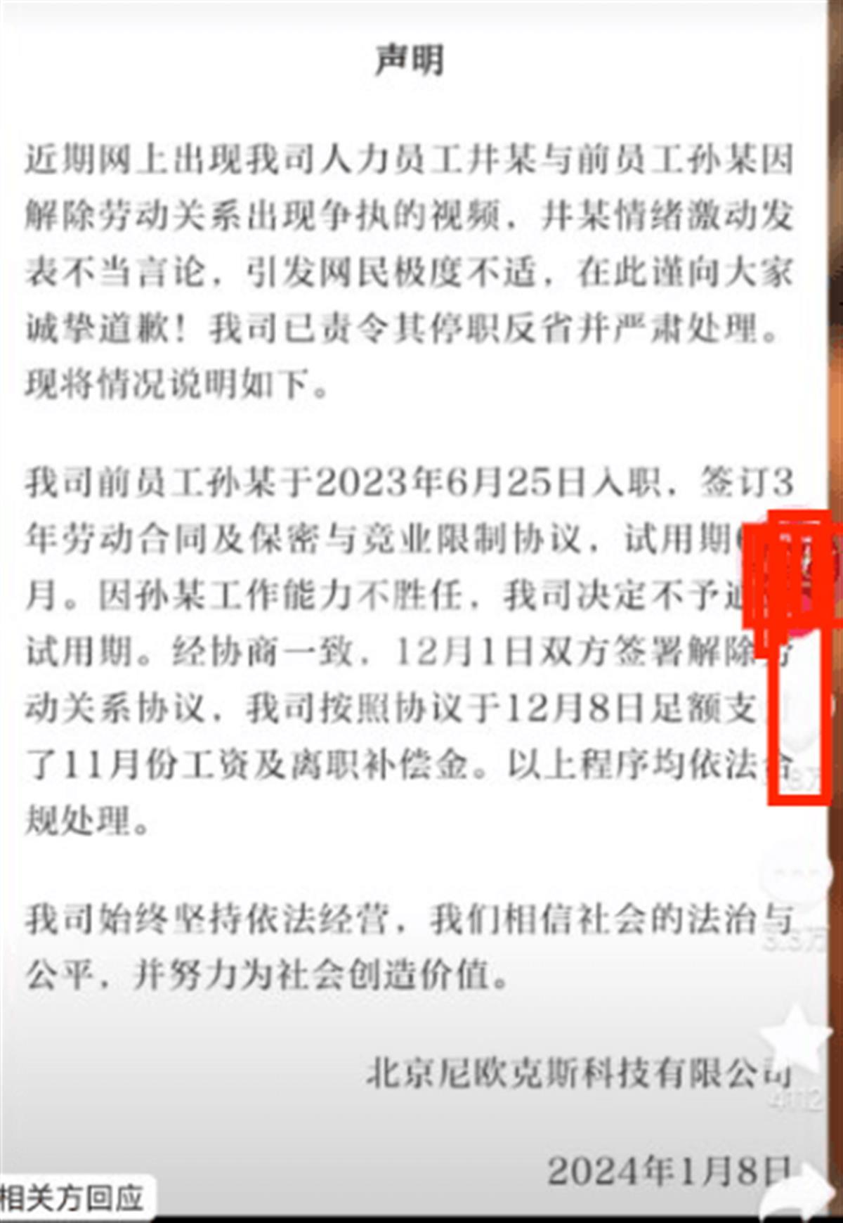 1月8日,涉事的北京尼欧克斯科技有限公司发声明称,该公司人力员工井某情绪激动发表不当言论,引发网民极度不适,在此谨向大家诚挚道歉,该公司已责令其停职反省并严肃处理。该公司在声明中还表示,该公司前员工孙某于2023年6月25日入职,签订3年劳动合同及保密与竞业限制协议,试用期6个月。因孙某工作能力不胜任,该公司决定不予通过试用期。经协商一致,12月1日双方签署解除劳动关系协议,该公司按照协议于12月8日足额支付了11月份工资及离职补偿金。以上程序均依法合规处理。