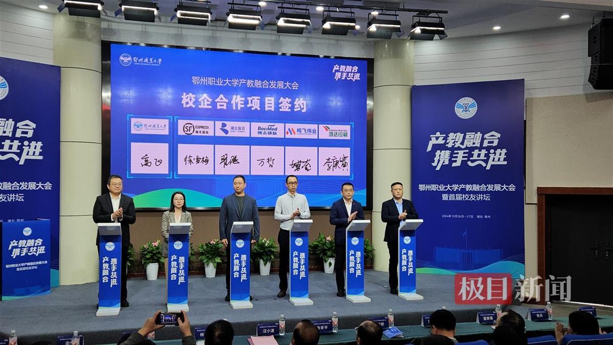 讲坛现场,鄂州职业大学与武汉京东方光电科技、顺丰鄂州国际花湖机场,以及湖北平步科技等多家企业进行了校企合作项目签订仪式,校长何保华为来自国内多个领域的10位行业、企业专家颁发产业导师聘书。随后,相关领导为鄂州职业大学与湖北国际物流机场有限公司共建的人才培养中心进行揭牌。