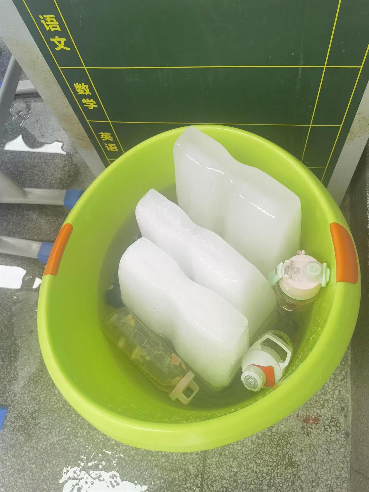 9月3日,长沙芙蓉区大同第二小学某班家委会成员高女士告诉记者,由于天气炎热,教室内气温较高,她便与冰厂取得联系,冰厂老板得知后,先是免费送了20块冰,在教室摆放冰块后,孩子们突发奇想,将水放在冰里面,“这样还喝上了冰水。”