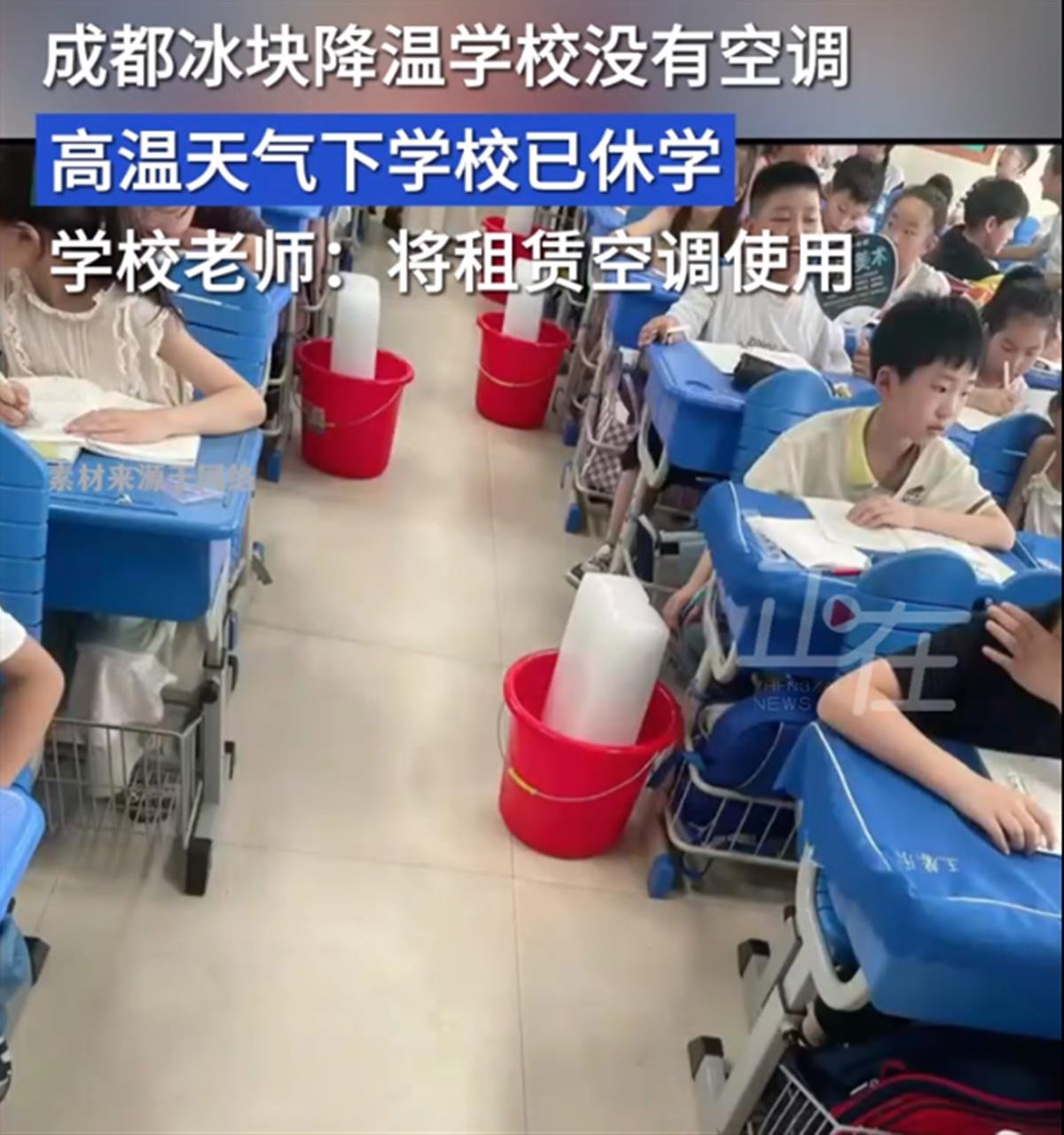 9月3日,学校老师表示,学校暂时没有空调,正在采购中,“因为是上级部门采购,时间比较长,暂时打算租空调用。”老师解释,由于担心孩子身体状况,学校才向教室内放置冰块,“我们昨天下午就已经通知家长接小孩回家,今天居家,后续复学需要等待教育局对天气进行研判。”