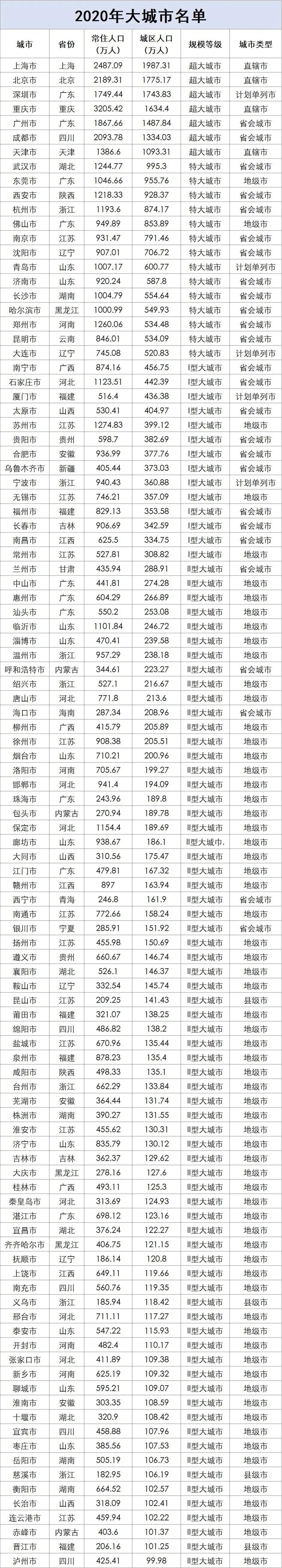 2020年大城市名单(来源:《2020中国人口普查分县资料》)