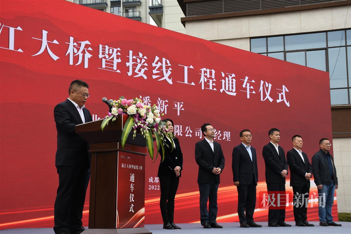 湖北建投集团、湖北路桥党委副书记、总经理潘新平作为施工方致辞。他表示,新蒲江大桥正式通车,是蒲江县与湖北路桥同频共振、同向发力、同步前行的新突破、新成果;是湖北路桥服务蒲江重大基础设施、服务重大民生建设的一件盛事、要事,也是蒲江基础设施建设提速、提质的一件大事、喜事。公司将继续立足“工程建设全领域总承包商”职责使命,以“建科技精品、树历史丰碑”为目标,不断优化项目管理,争创示范工地,打造精品工程,高质量、高标准、高效率完成项目建设,与蒲江人民共同为“建设全国新发展格局”贡献力量,携手共同建设美丽蒲江。