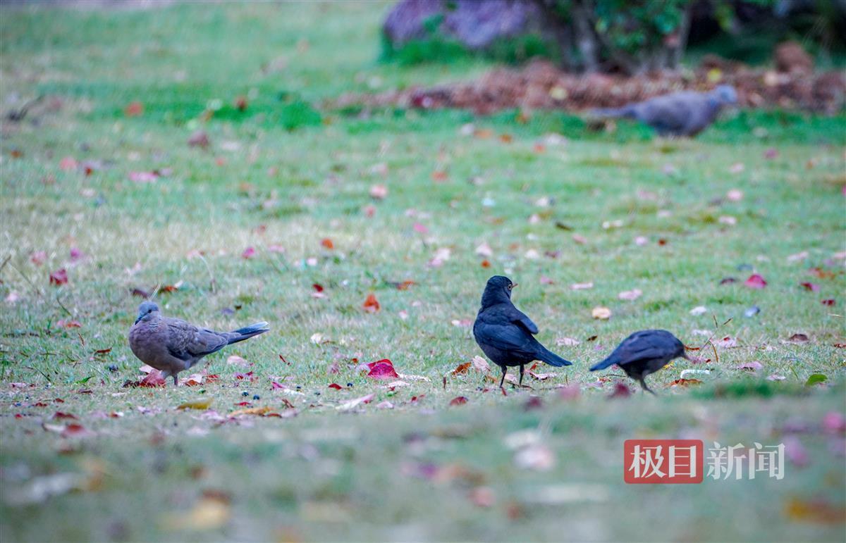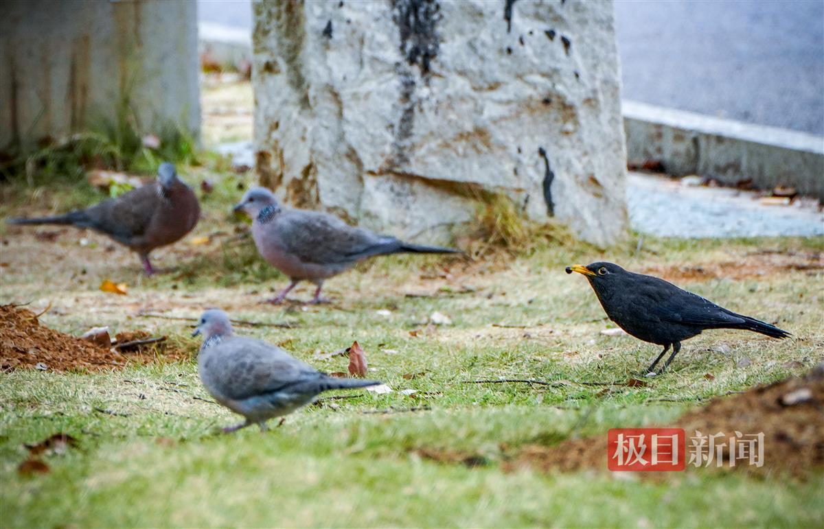 记者发现,在公园内觅食的林鸟种类真不少,除了斑鸠、灰喜鹊、乌鸫、八哥、麻雀外,还有丝光椋鸟等。