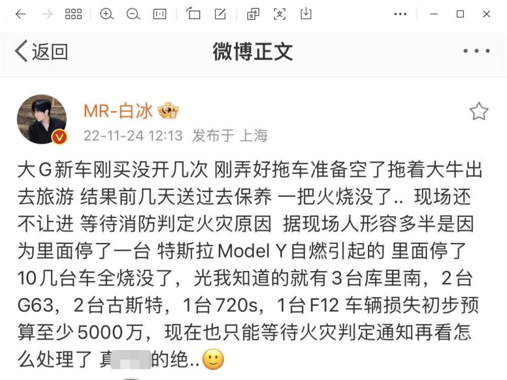知名汽车博主MR-白冰发布微博称,“大G新车刚买没开几次,结果前几天送过去保养一把火烧没了。光我知道的就有3台库里南,2台G63,2台古斯特,1台720s,1台F12,车辆损失初步预算至少5000万。”消息发布后,多名汽车博主转发证实了此事,并表示自己的车也在其中。