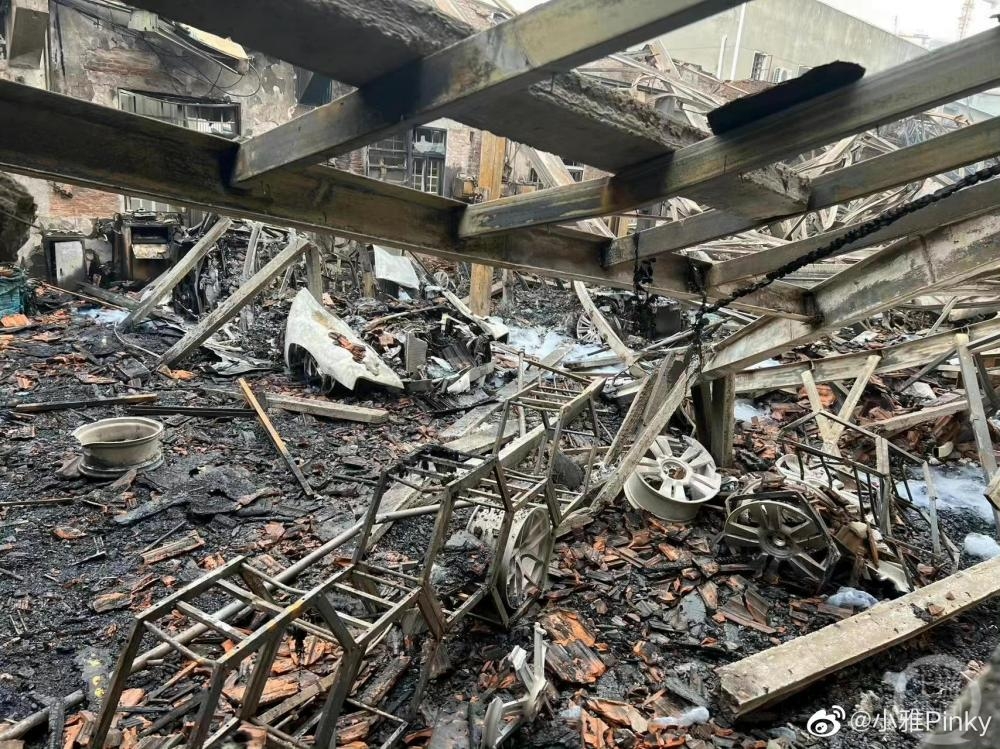 网传图片表示,涉事汽车装潢店被烧得面目全非,被烧车辆仅能看出框架和汽车轮毂形状,但难以分辨出车的类型。