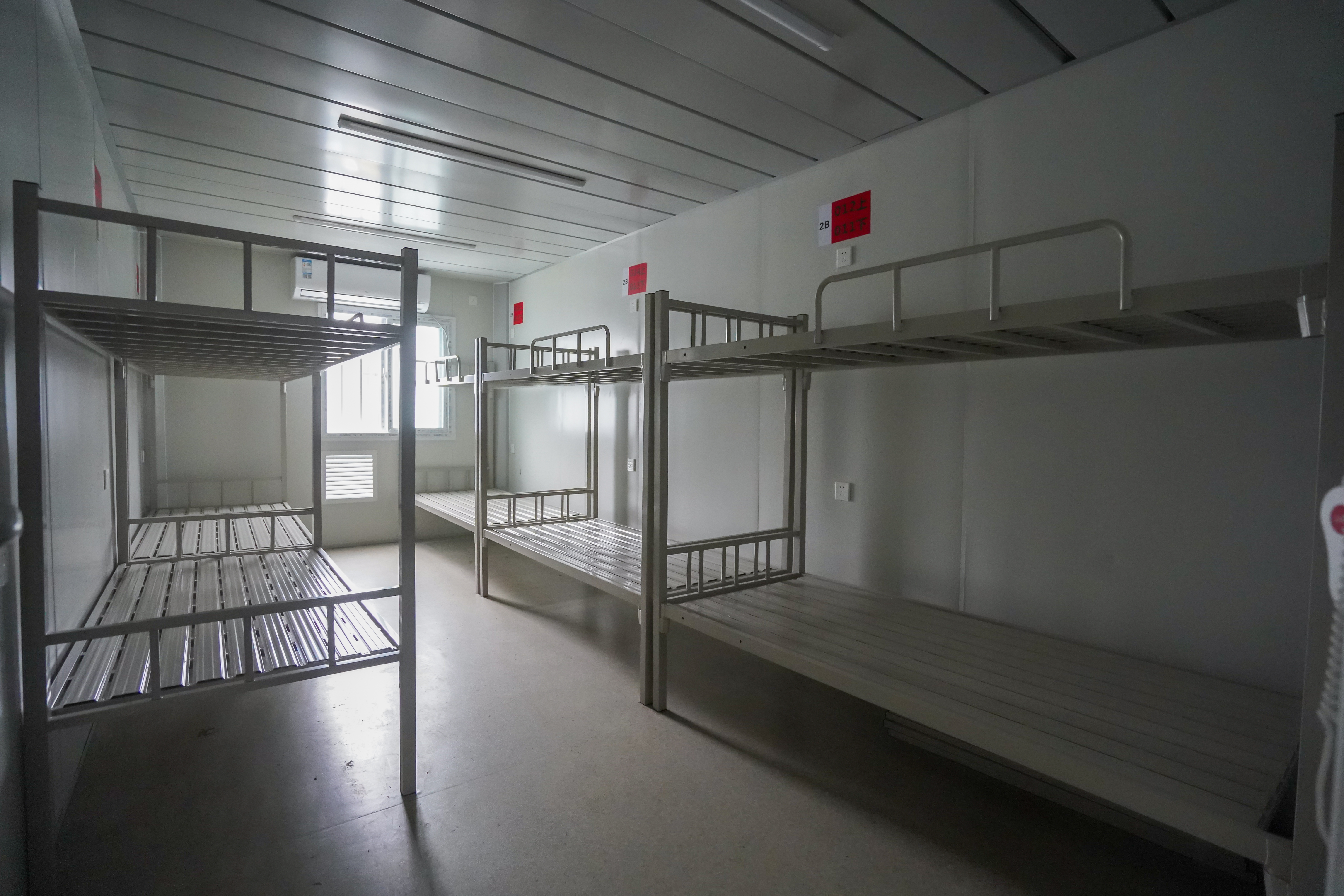 走进施工现场,记者看到为了确保污染区废弃气体安全排放,房间已按照负压要求新增了抽排风系统,排风量按每人不小于150立方米/小时设计,抽排风系统每小时可提供6000立方米的新鲜空气,可满足同时容纳40人的空间需求。经过箱式过滤消杀装置过滤清洁后,可实现有组织排放。每个打包箱建成后都将通过上下铺的形式,容纳5-10人居住,并安装了空调、饮水机等。