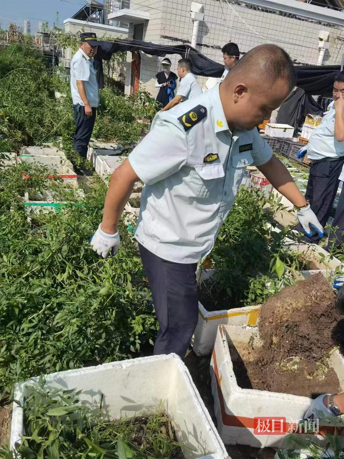 今年5月19日,种菜居民将蔬菜采摘完毕。在执法队员的帮助下,物业公司组织清运人员,对楼顶菜园进行清理。