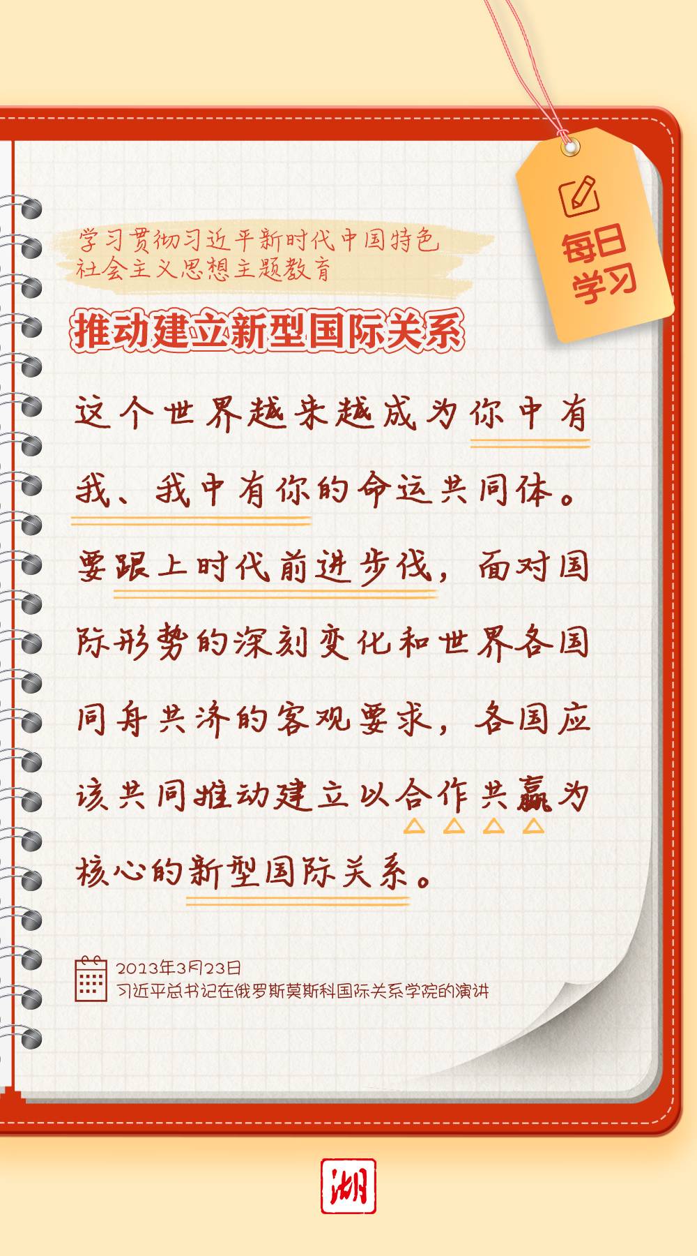 2013年3月23日,习近平总书记在俄罗斯莫斯科国际关系学院的演讲中指出,要顺应时代前进潮流,促进世界和平发展。