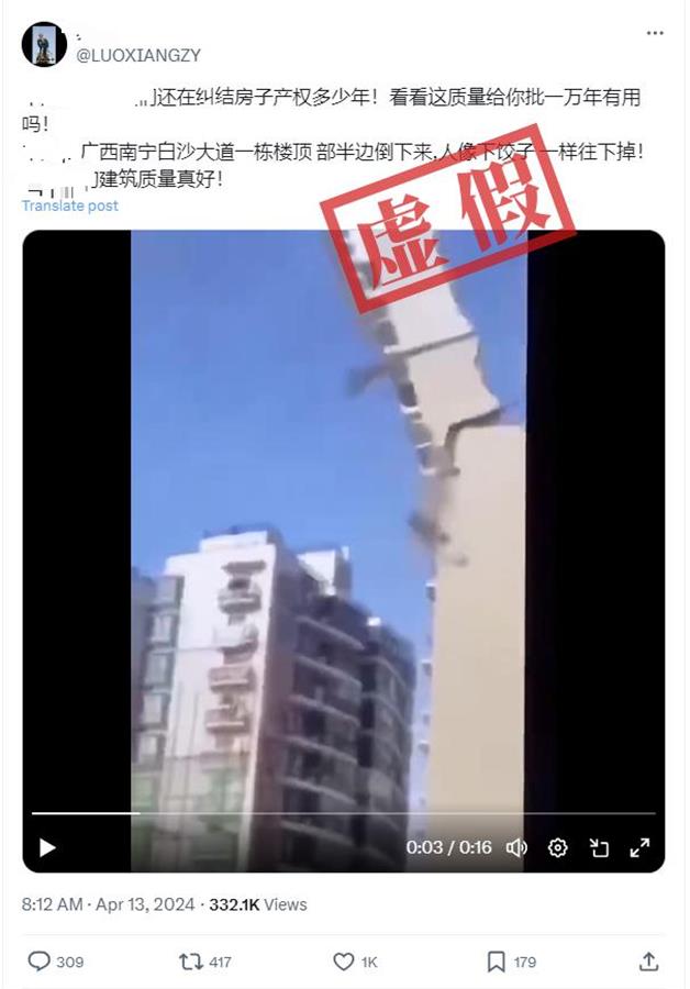 据澎湃新闻18日报道:近日,国外社交平台上有说法称,“广西南宁白沙大道一栋楼顶部半边倒下来,人像下饺子一样往下掉。”实际上,这个谣言早在2019年4月就已经出现,视频展示的是正常的楼房拆除工作。
